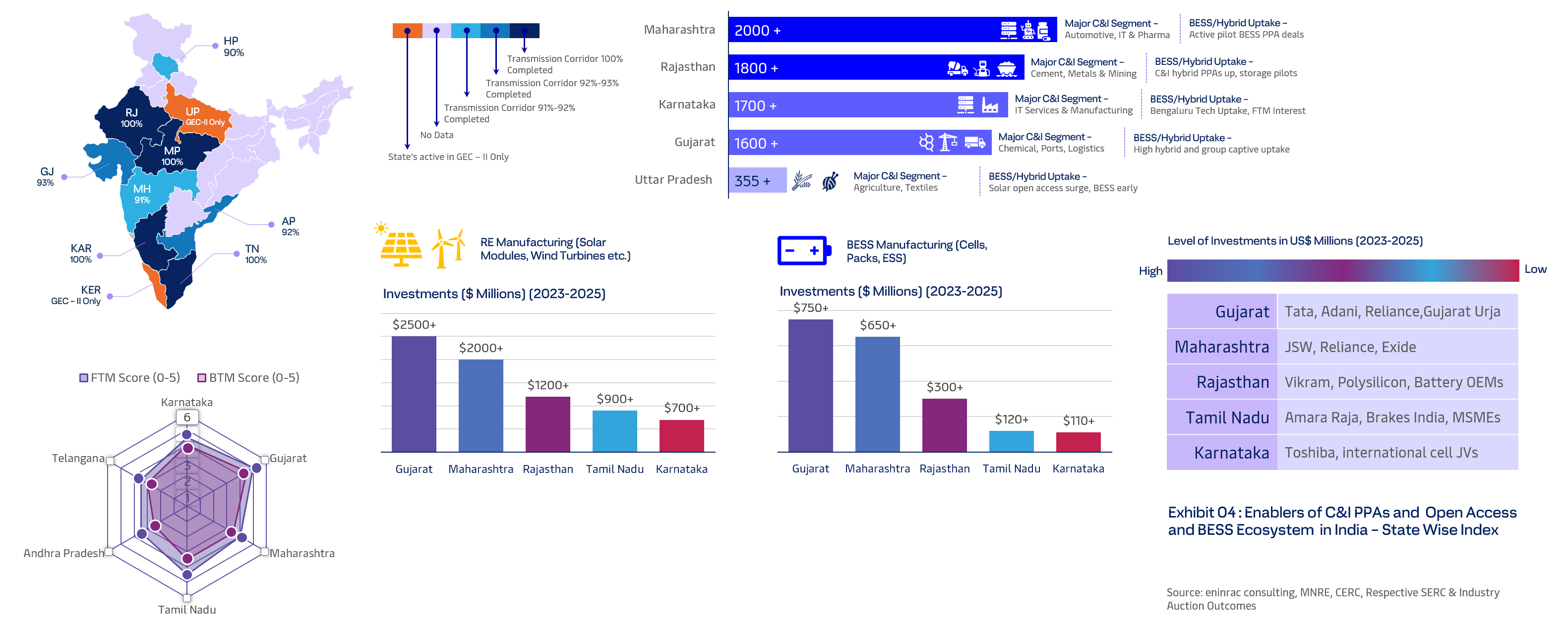 Maharashtra shows robust FTM development (4.0) with growing BTM traction (3.5), using policy incentives to support solar parks and pilot battery storage contracts. Its significant industrial and commercial demand enables steady storage adoption, although BTM market evolution is still maturing.