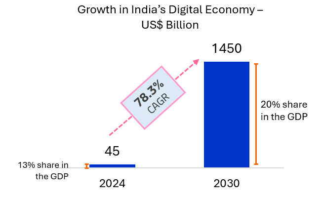 By 2030, India’s digital economy is projected to contribute nearly 1/5th of the nation’s overall GDP. India is on the track to become the world’s third largest economy with a projected GDP of US$ 7.3 Trillion by 2030 (as per S&P) and the share of digital economy would around US$ 1.46 Trillion.